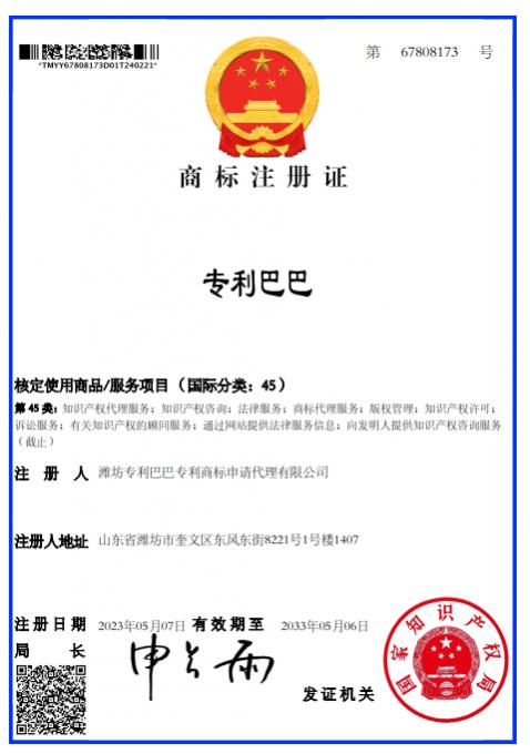 潍坊专利巴巴成功取得专利巴巴注册商标证书