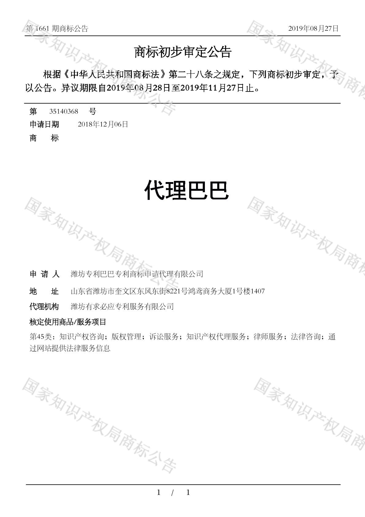 2019年08月27日,潍坊专利巴巴专利商标申请代理有限公司申请的代理巴巴商标获得国家商标局初审公告,初审公告期号为:第1661期。