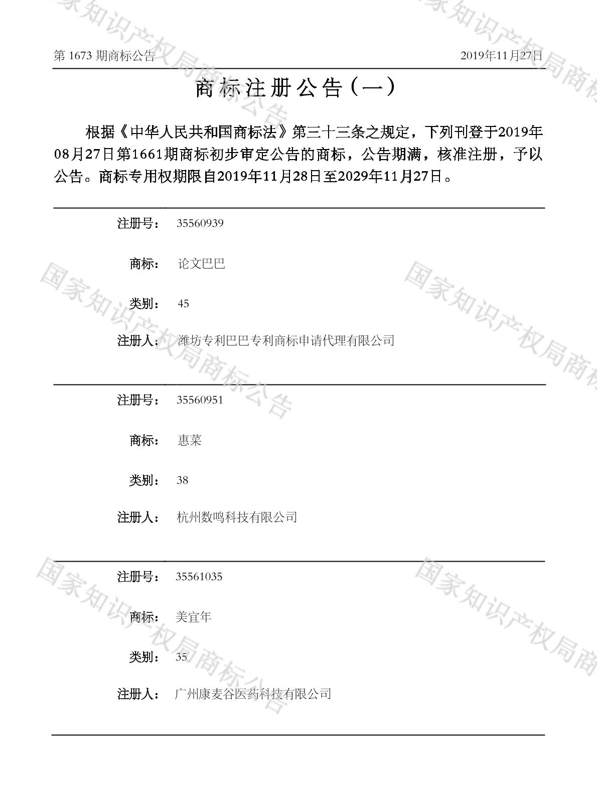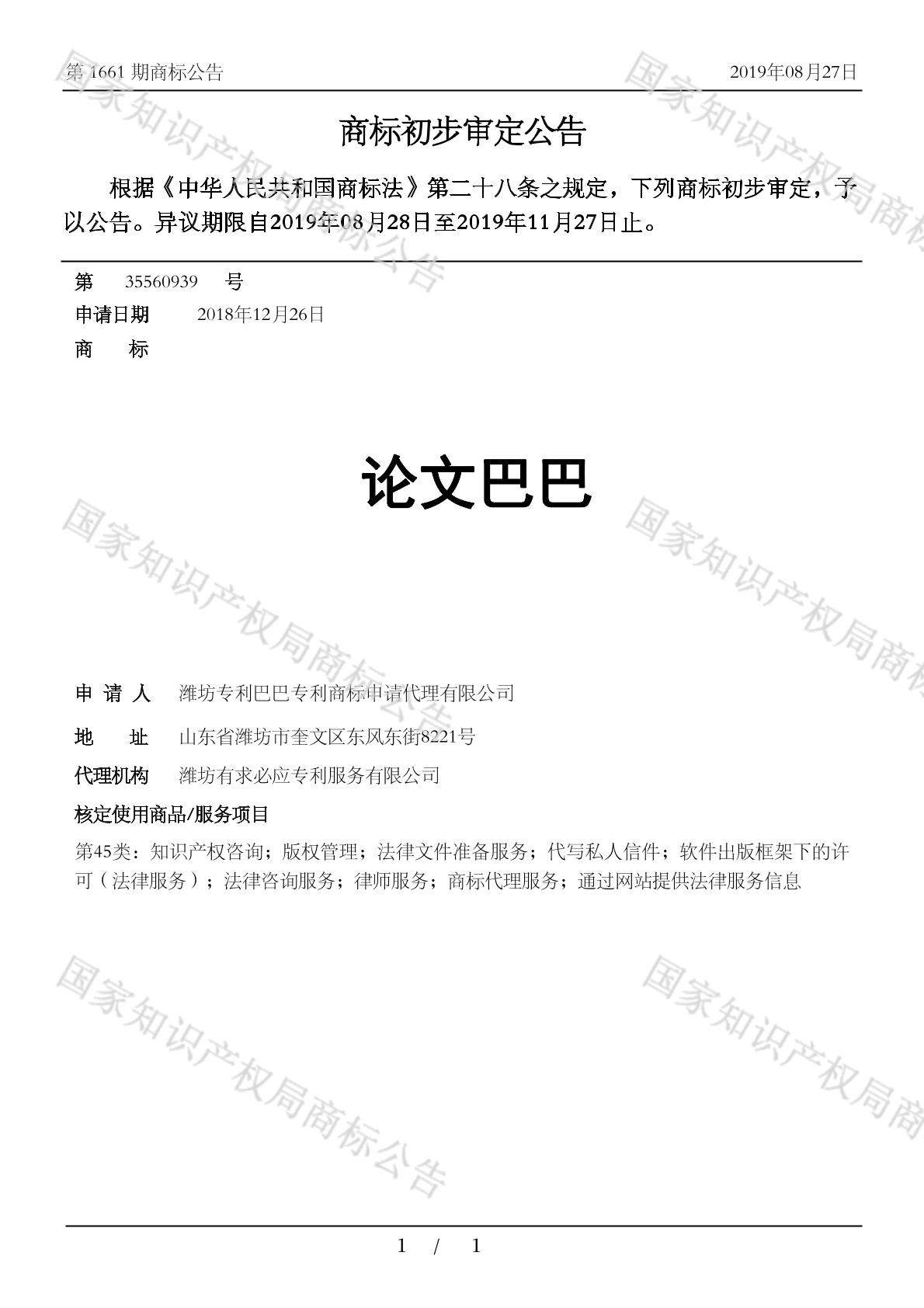 2019年12月31日,潍坊专利巴巴专利商标申请代理有限公司向国家商标局正式就论文巴巴商标提出注册申请。