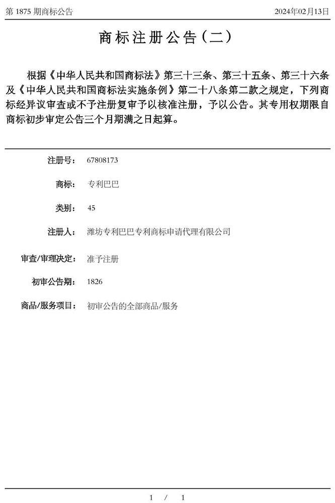 2024年02月14日,专利巴巴商标获得注册公告。