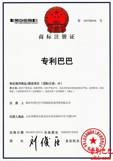 专利巴巴是潍坊专利巴巴专利商标申请代理有限公司的注册商标。专利巴巴商标由潍坊专利巴巴专利商标申请代理有限公司于2015年5月18日向国家商标局提交商标注册申请,专利巴巴商标的注册号是16975850A,专利巴巴品牌商标的专用权期限是2016年07月21日 至 2026年07月20日。专利巴巴商标证书如下图所示。
