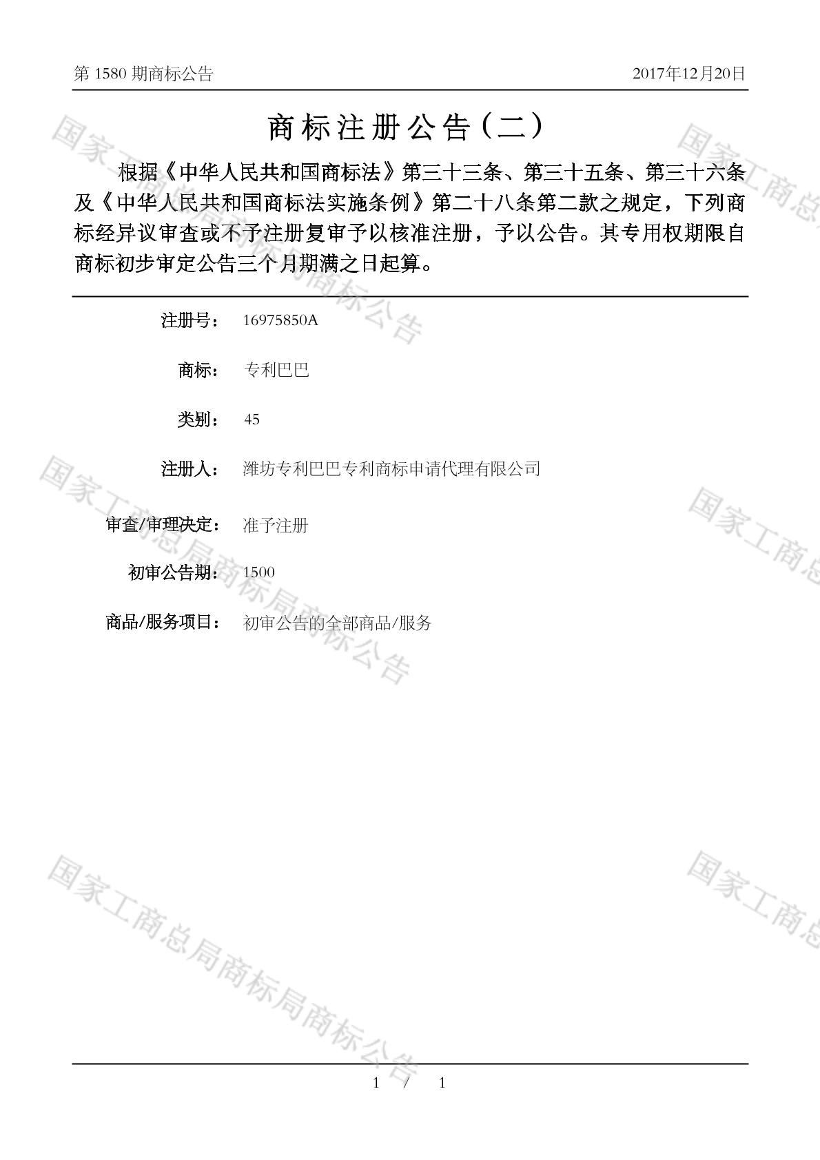 2015年5月8日,潍坊专利巴巴专利商标申请代理有限公司向国家商标局正式就专利巴巴商标提出注册申请。