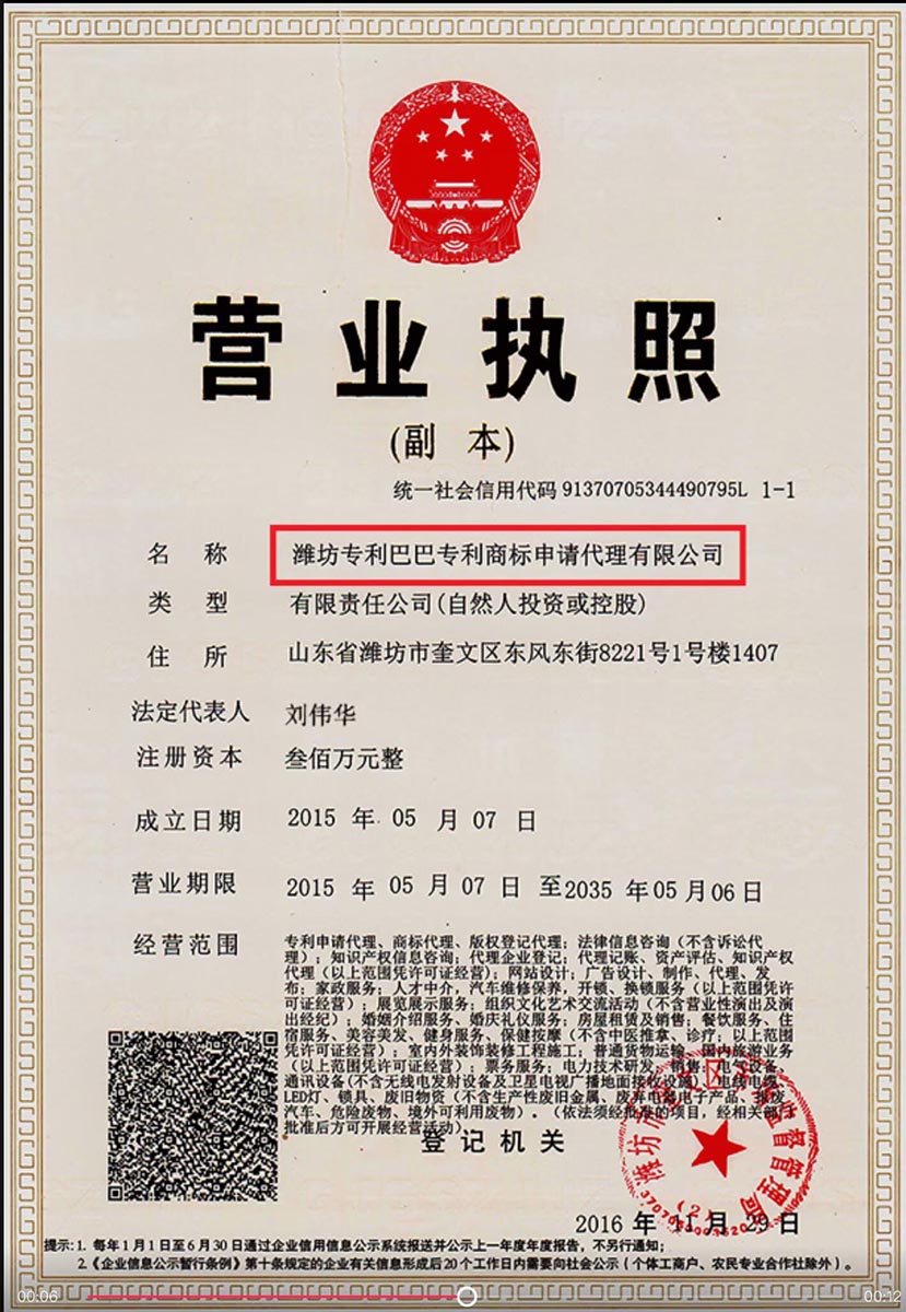 2015年05月07日,潍坊专利巴巴专利商标申请代理有限公司注册成立,营业执照如下图所示。