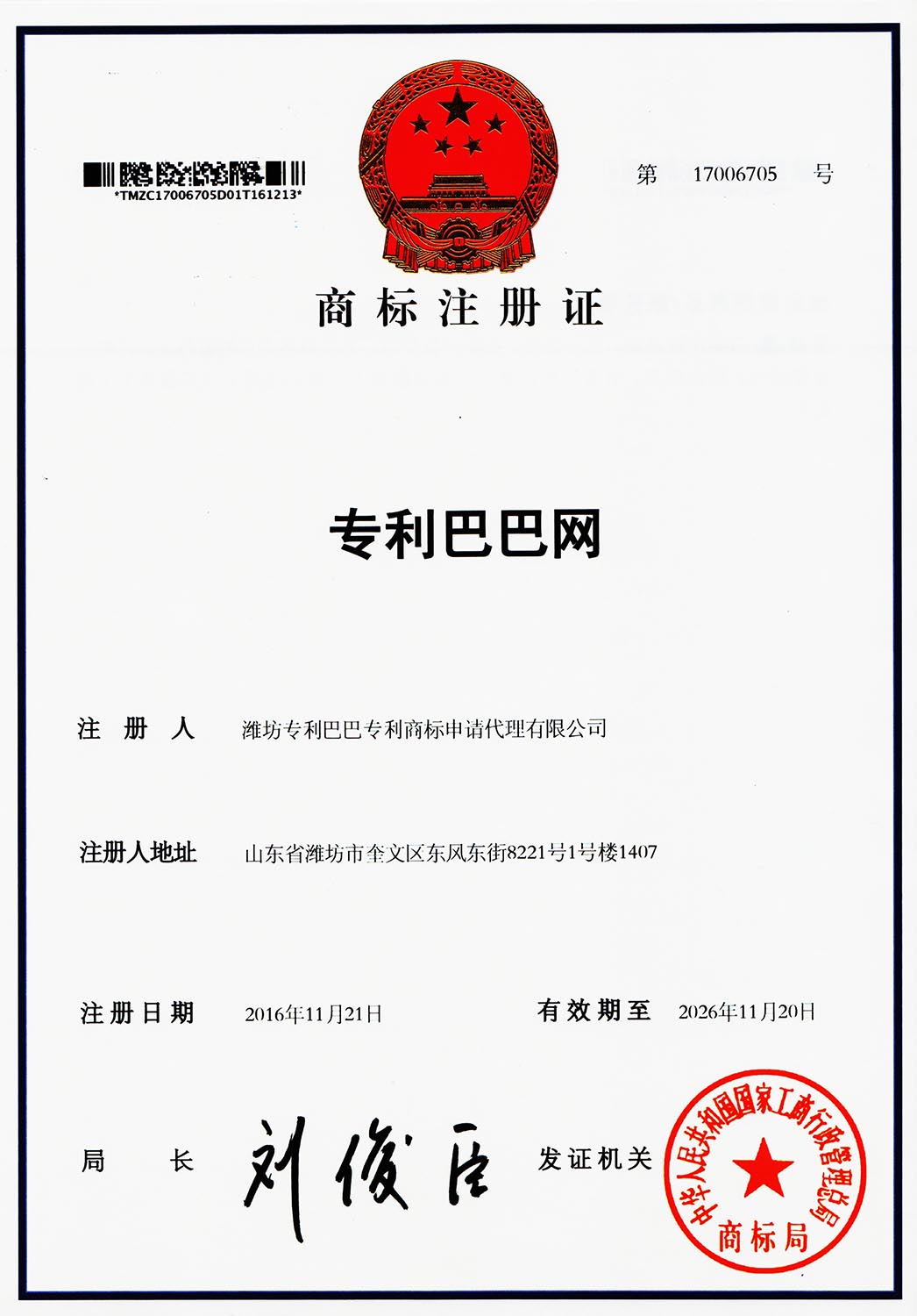 专利巴巴网的商标注册号是17006705,该品牌商标专用权期限是2016年11月21日 至 2026年11月20日。专利巴巴网注册商标的代理机构是潍坊有求必应专利服务有限公司